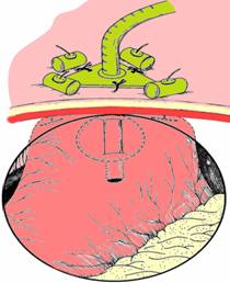 4. Gastrostomia Witzel consta in realizarea unui tunel seromuscular din peretele stomacului, prin care tubul de gastrostomie ajunge la perete (Fig. 9). Avantajele tehnicii sunt o etanseitate foarte buna si inchiderea rapida a traiectului dupa suprimarea tubului.