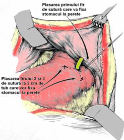 Tubul de gastrostomie este introdus pe o distanta de 7 cm in stomac in regiunea pilorica, in directia duodenului. In jurul tubului se realizeaza o bursa cu un fir de sutura neresorbabil, incarcand peretele seromuscular gastric. Se strange bursa si se face un nod intern. Se realizeaza o a doua bursa cu ajutorul careia peretele stomacului este infundat in jurul tubului de gastrostomie. Se realizeaza un tunel tip Witzel printr-o sutura continua, pe distanta de 2-3 cm pornind din vecinatatea ultimei burse; la sfarsitul suturii se realizeaza un nod. Peretele gastric este tractionat fara tensiune spre peretele abdominal anterior si este fixat prin doua fire transparietale. Tubul de gastrostomie este apoi fixat la piele (4).