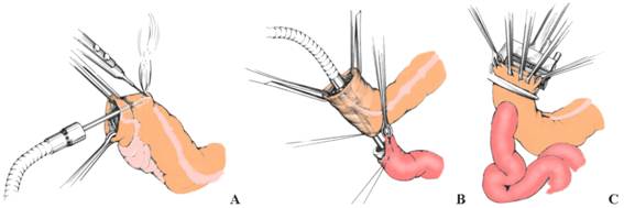 Anastomoza latero-laterala asigura o gura mai larga, un risc minim de fistula si se executa mai rapid. Se poate colmata datorita fundurilor de sac restante (10).