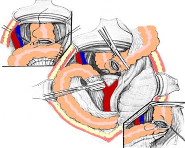 Restabilirea continuitatii digestive se preteaza la multiple variante tehnice: anastomoza termino-terminala, latero-terminala si latero-laterala, manuala (Fig. 23), in unul sau mai multe planuri cu surjet sau puncte separate si mecanica cu staplere GIA, EEA, TA. Uneori, concavitatea sub care se prezinta extremitatea transversului face mai abordabila anastomoza lateroterminala, care ofera, in plus, avantajul unei peritonizari mai largi.