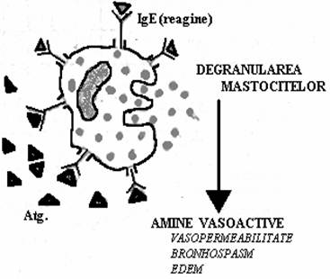 IgE exista in mod normal, in titruri mici, in serul tuturor indivizilor, iar sinteza lor sporeste ca raspuns normal de aparare fata de unele agresiuni, cum ar fi infestarea cu unii paraziti. IgE se comporta ca Atc. citofili: ele sunt atasate selectiv pe celule care exprima pe suprafata receptori specifici pentru segmentul Fc (RFc ) (mastocite si polinucleare bazofile). Alergenele induc productia unor IgE specifice (denumite generic 'reagine') care se ataseaza pasiv pe celulele RFc . Atasarea reaginelor pe mastocite este durabila (aprox. 2-3 luni) si duce la activarea mastocitelor purtatoare. Evenimentele descrise (productia IgE specifice si atasarea lor pasiva si durabila pe mastocite) au loc dupa primul contact cu alergenul (etapa 'sensibilizarii' organismului). In momentul in care alergenul patrunde din nou in organismul presensibilizat, el se va cupla cu IgE atasate pe mastocite si va declansa un semnal in urma caruia continutul granulatiilor acestor celule va fi deversat in mediul ambiant. (Fig.68)