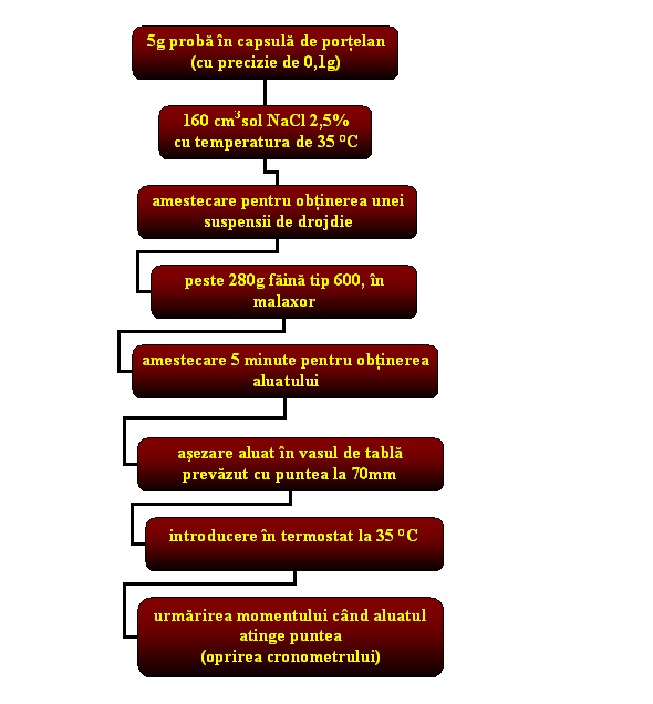 Se cronometreaza timpul de la inceperea obtinerii aluatului (amestecarea suspensiei cu faina) pana in momentul ridicarii bilei la suprafata apei.