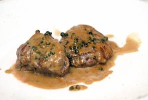 Muschiul de vita se taie in patru felii de cåte 100 g. Se apasa ca sa se lipeasca ferm boabele de piper pe suprafetele feliilor si se prajesc in untul topit in uleiul incins cate 2-3 minute pe fiecare parte. La sfårsit, se toarna coniacul, se flambeaza si dupa aceea se adauga småntåna.