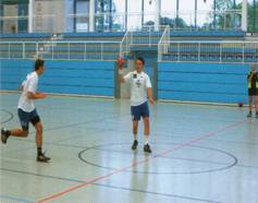 Nota: Executantul are 3 secunde la dispozitie pentru a executa aruncarea, in orice directie, dupa ce s-a auzit fluierul arbitrului (10:3). Daca se sincronizeaza bine, un coechipier poate alerga in jumatatea adversa de teren inainte ca mingea sa fi parasit mana executantului. In acest exemplu, extrema alearga in lungul liniei de margine. In functie de cum este jucata mingea, aceasta poate duce la un contraatac, in care extrema poate arunca la poarta. |
