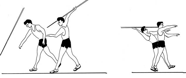 -exercitii de mers cu purtarea sulitei deasupra umarului,
