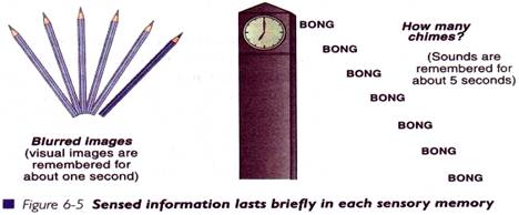 Nervii senzitivi, ca de exemplul nervul optic al ochiului sau nervul auditiv al urechii transmit informatia catre SNC (creierul si maduva spinarii), unde aceasta este procesata. Inainte de a fi inlocuita, informatia senzoriala este stocata pentru scurt timp in memoria senzitiva, in afara de cazul in care decidem sa o absorbim si sa o procesam. Fiecare senzor are memoria lui care variaza ca durata de la unul la altul. De exemplu, imaginea dureaza aprope o secunda, dupa care se estompeaza si dispare ( imaginea unui creion penduland in fata ochilor nostri se estompeaza rapid, ramanand mai clare doar pozitia initiala si finala). Filmele activeaza aceasta memorie care ne da impresia unor imagini in miscare, desi acestea sunt o succesiune rapida de cadre. Sunetele au o durata mai mare, aproape 5 secunde, dupa care se estompeaza. Este un timp suficient sa recunoastem o fraza care ne este adresata, sa-i redam inceputul sau sa numaram de cate ori a sunat ceasul.