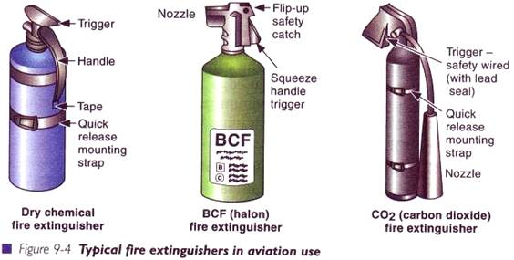Multe avioane usoare sunt dotate cu stingatoare de incendiu mici, amplasate la indemana pilotului, astfel incat acesta sa-l poata folosi in timpul zborului. Subsatantele utilizate pentru stingerea incendiilor sunt BCF (bromclordifluorometan) , halon 1211 sau substante chimice uscate (pudre), care pot fi folosite in marea majoritate a incendiilor. Alte extinctoare pot sa contina apa cu spuma.