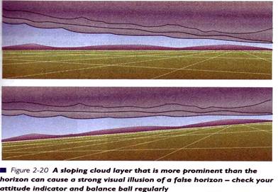 Stratificarea norilor ziua, sau suprafetele cu linii unghiulare ori zone luminoase noaptea, creaza uneori pentru pilot un orizont fals ceea ce este foarte inselator. Consultarea instrumentelor de zbor va confirma atitudinea in zbor.