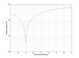 Fig 2.2 Variatia dispersiei, respectiv a produsului rata de bit-distanta in fuctie de parametrul profilului, g.
