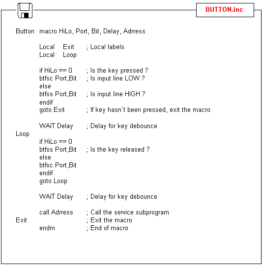 Exemplul urmator arata modul de folosire intr-un program. BUTTON.ASM aprinde si stinge LEDul. LEDul este conectat la cea de-a saptea iesire a portului B. Tasta-1 este folosita pentru a aprinde LEDul. Tasta-2 stinge LEDul.