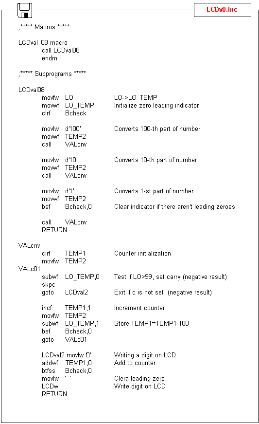Macroul LCDval_08 realizeaza conversia unui numar binar de 8 biti intr-un numar zecimal de la 0 la 255 si il afiseaza. Este necesar sa declaram urmatoarele variabile in programul principal: TEMP1, TEMP2, LO, LO_TEMP, Bcheck. Numarul binar de 8 biti este in variabila LO. Cand macroul este executat, echivalentul zecimal al acestui numar este afisat. Zerourile precedente numarului nu sunt afisate.