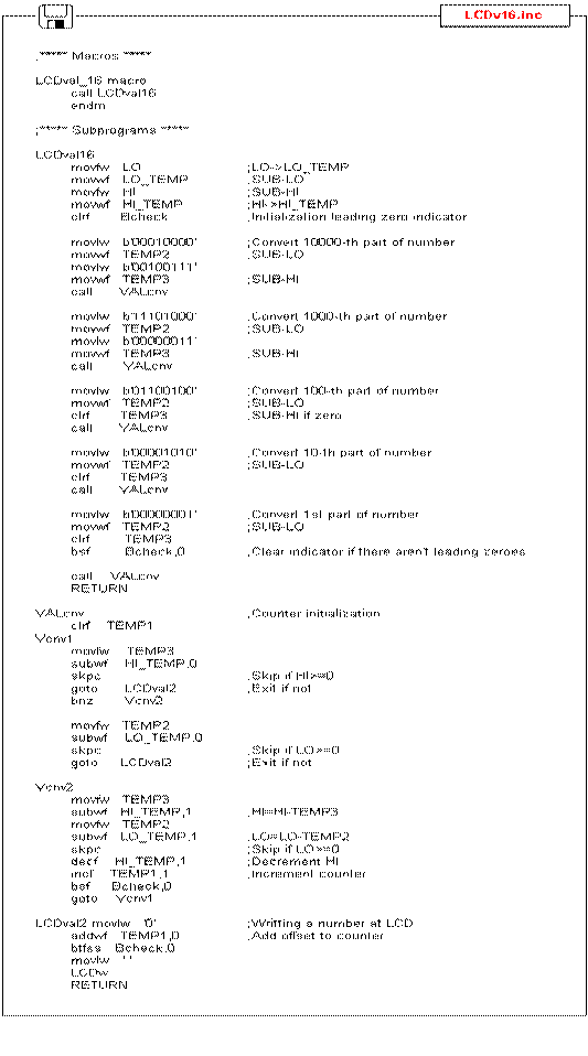 Macroul LCDval_16 realizeaza conversia unui numar binar de 16 biti intr-un numar zecimal de la 0 la 65535 si il afiseaza. Urmatoarele variabile trebuie declarate in programul pricipal: TEMP1, TEMP2, TEMP3, LO, HI, LO_TEMP. HI_TEMP, Bcheck. Numarul binar de 16 biti este in variabilele LO si HI. Cand macroul este executat, echivalentul zecimal al acestui numar este afisat. Zerourile precedente numarului nu sunt afisate.