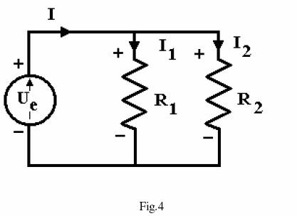 In fig.4 este prezentata schema unui divizor de curent alcatuit dintr-o sursa de tensiune continua e U si di doua rezistente legate in paralel R1 si R2 :