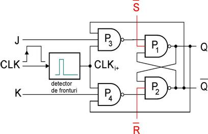 Descrierea functionarii Deoarece semnalul intern de tact CLKi+ este activ cateva nanosecunde, modificarea nivelului logic la S sau R poate afecta iesirea Q doar scurt timp inainte si dupa de frontul crescator al semnalului de tact CLK - aceasta comportare determina comanda pe front a bistabilului. Simbolul acestui bistabil este dat in figura 10 - dreapta.