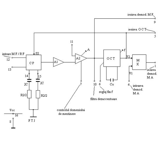 Semnalul MF se aplica la intrarea CP, iar semnalul demodulat se obtine la iesirea A2. Semnalul MF trebuie sa aiba amplitudinea mai mare ca 120μV. Relatiile de calcul pentru elementele circuitului sunt :