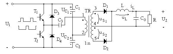 In sursa analizata este folosit un convertor c.c.-c.c. in semipunte, a carui schema este prezentata in figura 1.2 Formele de unda specifice acestui convertor sunt prezentate in figura 1.3