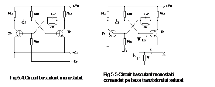 -circuite basculante bistabile de tip RS (fig 5.10.a), la care comanda se face pe baze, pe doua intrari numite R si S, cu impulsuri dreptunghiulare aplicate prin intermediul unui circuit de derivare si o dioda ce selecteaza polaritatea dorita pentru impulsul de comanda.Impulsul aplicat pe R aduce circuitul intr-o stare notata "0" iar cel aplicat pe S aduce circuitul in starea"1". Aplicand simultan impulsuri pe ambele intrari, rezulta o stare de nedeterminare, in sensul ca circuitul poate ramane intamplator fie in starea anterioara aplicarii impulsului, fie poate bascula;
