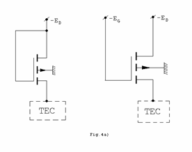 Constructiv, rezistorul de tip TEC-MOS se realizeaza fie prin conectarea grilei cu drena, fie prin conectarea grilei la o sursa separata (Fig.4a). Sursa TEC de sarcina este conectata cu TEC-ul care realizeaza prelucrarea logica. Cand grila se conecteaza la drena, deoarece UGS=UDS=ED TEC-ul de sarcina va functiona saturat intrucat │UDS│>│UGS-Up │ (Fig.4b). In acest caz tensiunea obtinuta pe drena TEC de prelucrare logica la blocarea acestuia va fi mai mica decat ED cu valoarea Up. Daca grila se conecteaza la sursa separata de valoare EG mai mare decat ED cu cel putin Up, in asa fel ca sa fie satisfacuta relatia │UDS│>│UGS-Up│, TEC-ul de sarcina va functiona pe portiunea nesaturata a caracteristicii. In acest caz la iesire va fi apropiat de ED. Dezavantajul necesitatii unei surse suplimentare este compensat de faptul ca aceasta trebuie sa asigure practic numai polarizarea, consumul fiind neglijabil.