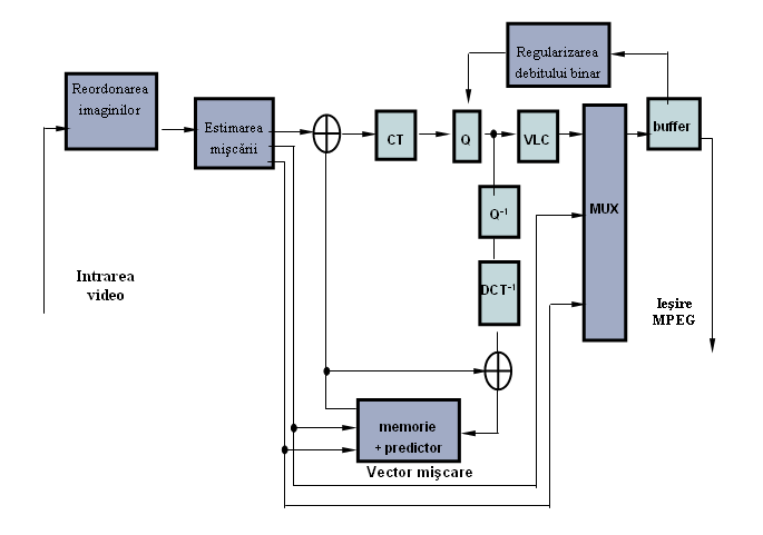 In scopul controlului debitului binar de la iesirea codorului, acesta este echipat cu un buffer de tip FIFO (First In First Out); cantitatea de informatie pastrata in acest buffer este monitorizata si mentinuta intre limite predeterminate prin intermediul unei bucle de reactie prin care se poate comanda modificarea parametrilor de cuantizare, care au o influenta semnificativa asupra debitului secventei codate. Astfel este posibil obtinerea unui debit constant cu o rezolutie ce depinde de continutul si dinamica imaginii (in sensul ca o mai mare miscare determina o mai mica rezolutie). O schema bloc foarte generala a codorului MPEG, ce ofera doar o imagine globala si foarte departe de complexitatea reala a acestuia este data in Figura 11.