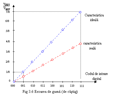 In figura 9 este prezentata caracteristica ideala si o caracteristica reala pentru un convertor numeric analogic de 3 biti punandu-se in evidenta erorile de neliniaritate integrala.