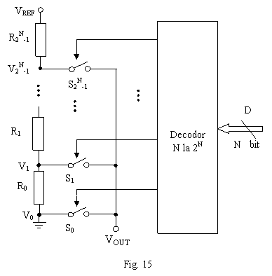 Idea de baza este obtinerea valorii de iesire prin selectarea unui nivel de tensiune corespunzator valorii binare a codului de intrare. Schema de principiu a unui astfel de convertor numeric analogic de N biti este prezentata in figura 13