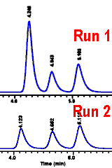 Aici varful #1 (compusul A) arata schimbari in timpul de retinere de 4.1 minute in determinarea a doua. Aceasta ar putea fi rezultatul a unor compusi care se intrepatrund care suprapun partial varful #1, care ar putea cauza erori mari in valoarea raportata a compusului A. in acest caz compusul pur A ar trebui injectat pentru a confirma timpul lui de retinere. Daca descoperim ca ceva nu este in regula cu acesta determinare concentratia compuslui A in aceasta proba nu ar trebui raportata.