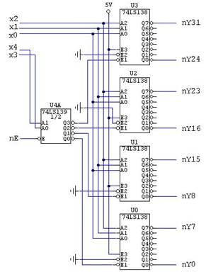 Combinatiile variabilelor x4 - x0 sunt prezentate in tabelul nEN este o intrare globala de validare; pentru nEN = 1, toate iesirile sunt inactive (1 logic). De obicei x4 - x0 sunt biti de adresa, rangurile mai semnificative fiind utilizate pentru selectia decodificatorului activ (x4 - x3 selecteaza U0 - U3), iar rangurile mai putin semnificative o anumita iesire dintr-un DCD (x2 - x0 selecteaza una din cele 8 iesiri ale unui DCD).