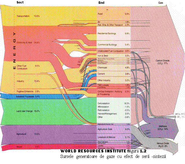 O sinteza foarte graitoare in ceea ce priveste sursele generatoare de gaze cu efect de sera, zonele de prelucrare si utilizare a acestor resurse, precum si efectele rezultate este prezentata in figura 1.3(care sea afla la pagina 20), din care cel mai frapant este locul dominant al energiei in producerea de CO2