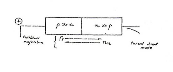 La polarizarea directa a jonctiunii 'pn', concentratiile de portatori minoritari in apropierea junctiunii cresc in raport cu valorile corespunzatoare de la echilibru, putandu-se aprecia ca un proces de injectie de purtatori minoritari in exces. Astfel, golurile (purtatori majoritari in regiunea 'p') difuzeaza prin regiunea de sarcina spatiala si sunt injectate in exces in regiunea de tip 'n' unde creasca concentratia de purtatoti minoritari. Dar, aceste goluri minoritare injectate in ragiunea 'n' au un anumit timp de viata, tp , si vor difuza spre interiorul regiunii de tip 'n' pana la o anumita adancime de patrundere, numita lungime de difuzie - Lp, pana la completa lor recombinare cu electronii majoritati.