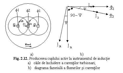 Fluxul F al curentului i1 strabate discul de doua ori, in timp ce F , produs de electromagnetul 2, il strabate o singura data, inchizandu-se in armatura de sub disc. Astfel discul este strabatut de trei ori de fluxurile produse de cei doi electromagneti. Fluxurile F si F fiind alternative induc in disc curentii turbionari i1t si i2t care se inchid in jurul fluxurilor care ii produc - fig. 2.12, a.