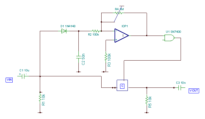 Dioda D si condensatorul C2 formeaza un detector de varf. Tensiunea de pe condensatorul C2 este amplificata de amplificatorul operational AO si aplicata portii SI-NU (NAND), construita cu tranzistoare din capsula MMC 4007. Caracteristica de transfer a portii este foarte abrupta. Cand tensiunea de la intrarea 6 a portii SI-NU (NAND) scade sub tensiunea de tranzitie, iesirea trece in 1 logic, deschizand poarta de transfer. In acest caz, semnalul de la intrare se regaseste la iesire. Din rezistenta semireglabila R4 se regleaza sensibilitatea circuitului. Daca tensiunea de la intrarea 6 a portii SI-NU (NAND) creste peste tensiunea de tranzitie, iesirea trece in 0 logic, blocand poarta de transfer.
