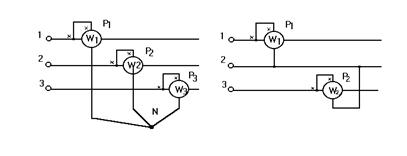 Fig.3. Metode de masurare a P pentru circuit trifazat cu conductor neutru.