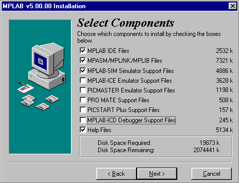 La inceput de tot, este necesar de a selecta acele componente MPLAB cu care vom lucra. Pentru ca nu avem nici o componenta hardware originala Microchip ca programatori sau emulatoare, vom instala doar mediul MPLAB, Assembler-ul, Simulatorul si instructiunile.