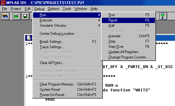 Primul lucru pe care trebuie sa-l facem este, ca intr-o situatie reala, este de a reseta un microcontroler cu comanda DEBUG > RUN > RESET. Aceasta comanda rezulta in linia ingrosata pozitionata la inceputul unui program, si contorul programului este pozitionat la zero ceea ce poate fi observat in linia de stare (pc: 0x00).