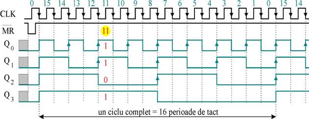 La un moment dat codul binar de iesire corespunde numarului de impulsuri de tact aplicate in ciclul respectiv, in aceasta constand practic functia de numarare. Citind iesirile dupa cel de-al 11-lea impuls de tact, rezulta Q Q Q Q = 1011, care este tocmai corespondentul in binar al numarului zecimal 11.