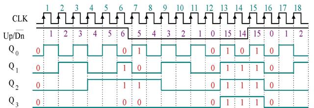 In figura 2 s-a reprezentat un ciclu complet de functionare si partial inceputul celui de-al doilea ciclu. Iesirile numaratorului evolueaza in sens crescator (direct), cu fiecare impuls de tact aplicat valoarea la iesire creste cu o unitate. Numaratorul prezentat este modulo 16 (are 4 bistabile). Cel de-al 16-lea impuls de tact incheie ciclul, el aducand numaratorul pe zero. Cel de-al 17-lea este primul impuls de tact din cel de-al doilea ciclu.
