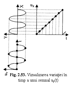 In general, cu ajutorul osciloscoapelor se vizualizeaza variatia in timp a tensiunii de intrare; in acest scop, pe placile de deflexie pe orizontala se aplica o tensiune liniar - variabila (tensiune de baleiaj). Intrucat fiecarui punct de pe curba uY(t), aplicata pe intrarea Y, ii corespunde in timp un punct de pe functia liniara uX(t), aplicata pe placile X, pe ecran se reproduce forma tensiunii uY in coordonatele Y - X (figura 2.53).