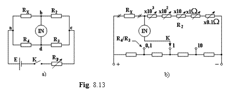 Schema de principiu a puntii Wheatstone este data in fig. 8.13, unde RX este necunoscuta, R2, R3, R4 - rezistente calibrate, IN indicator de nul (galvanometru sau milivoltmetru electronic), E - o sursa de tensiune continua de 2 - 6 V (baterii sau alimentator de retea), iar Rp - o rezistenta de protectie (zeci de kW) necesara limitarii tensiunii pe IN, la inceputul operatiei de echilibrare.
