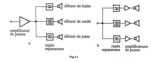 Un difuzor sau o incinta cu cai multiple este un sistem de mai multe difuzoare, in general combinate cu retele separatoare, in asa fel incat banda sa nominala de frecventa rezulta din compunerea celor ale difuzoarelor constituente. Sunt posibile structurile aval, cand retelele separatoare (filtrele) sunt plasate intre ampliflcatorul de putere si difuzoare, sau cele amonte, la care retelele de separare sunt plasate in fata a cate unui amplificator de putere, dupa cum se poate observa in figura 4.1