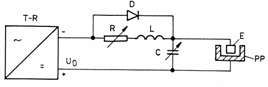 Daca distanta dintre electrodul scula E si piesa de prelucrat PP este suficient de mica pentru a fi strapunsa, prin spatiul de lucru va circula un curent limitat de rezistenta R. Tensiunile dintre electrozi vor scadea de la valoarea tensiunii de mers in gol a redresorului Uo la Ud, scadere sesizata de circuitul F (un trigger Schmidt), care va declansa circuitul pentru temporizarea duratei impulsului de curent t. Un alt circuit temporizeaza pauza dintre impulsurile de tensiune tp, blocand blocul de tranzistoare pentru a nu apare arc permanent.
