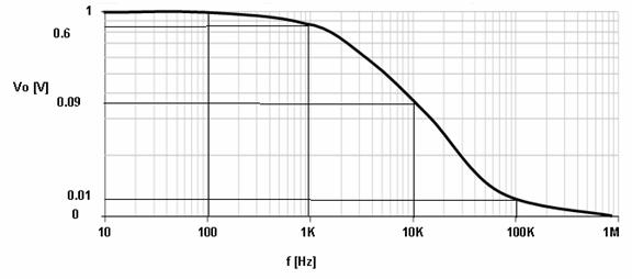 Se aplica circuitului un semnal sinusoidal cu amplitudinea de 1V si cu frecventele 10 Hz, 100 Hz, 1KHz, 10 KHz, 100 KHz si 1 MHz si se masoara pe osciloscop amplitudinea tensiunii de iesire, datele experimentale trecandu-se apoi intr-un tabel.