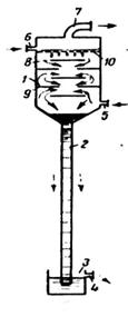 b) Condensatorul umed cu nivel scazut( fig2.b) se utilizeaza in cazul cand din motive de amplasare este imposibila amplasarea coloanei barometrice. Apa de racire impreuna cu condensul si cu gazele necondensabile sunt eliminate pe la partea inferioara de o pompa. Circulatia vaporilor si a apei se face in echicurent.