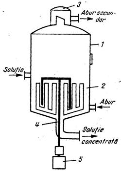 a) 1 -camerǎ de incǎlzire multitubularǎ, 2- vasul de detentǎ, 3- intrare tangentialǎ 4- iesire solutie concentratǎ, 5- prinzǎtor de picǎturi;