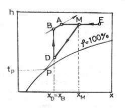 - Daca parametrii starii M sunt astfel incat xM<xB si hM>hD', atunci din starea M in starea B se poate ajunge asa cum s-a reprezentat in diagrama h-x, printr-o umidificare adiabatica MD, la hM=hD=constant, care se incheie atunci cand se atinge umiditatea absoluta a starii B (xD=xB), in camera de umidificare CU, urmata de incalzirea finala DB, la xD=xB=constant, pana la atingerea starii dorite B;