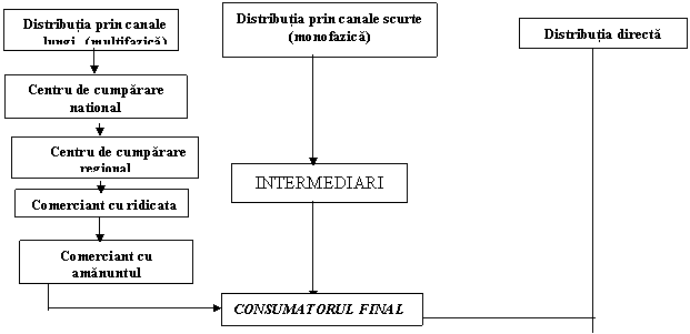 d) Un alt sistem de distributie, care se realizeaza pentru un segment tot mai larg de bunuri materiale, il constituie vanzarea directa practicata de producatori, catre consumatori, prin reteaua de magazine proprii, sau mai recent prin sistemul de franciza, cu scopul de a acoperi o plaja mai mare din piata vizata, dar si utilizarea instrumentarului propriu de metode si tehnici comerciale catre consumatorii vizati. Acest sistem este practicat la bunurile materiale industriale (echipamente, instalatii) sau la bunurii materiale de consum marci globale (Panasonic, Sony), calculatoare, mobila, etc.