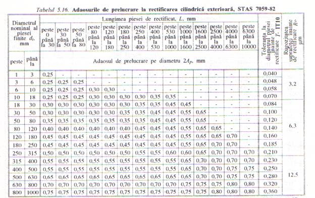 In functie de tipul rectificarii, materialul de prelucrat, diametrul si lungimea rectificarii se alegeadaosul de prelucrare pe diametrul 2Ap=0.40 mm (tabelul 5.16).