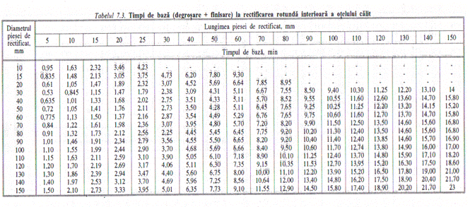 In functie de diametrul si lungimea de rectificat se alege timpul de baza Tb=(5.29+6.76)/2=6.03 min (tabelul 7.3).