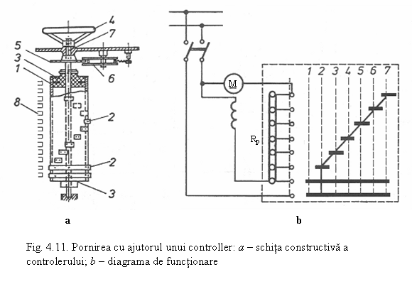 In figura 4.11, b este reprezentata diagrama de functionare a unui reostat de pornire tip controler. In pozitia 1 a reostatului, motorul este conectat la retea cu toata rezistenta in serie, iar, in pozitiile de la 2 la 7 treptele de rezistenta sunt scurtcircuitate in mod progresiv. In figura se vede desfasurata controlerului formata din segmentii rotorului si linia periilor fixe, la care sunt conectate punctele de separatie ale treptelor de rezistenta.