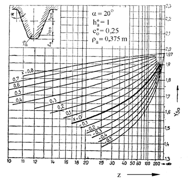 Fig. 4 Pentru dantura cilindrica cu dinti drepti nedeplasata se va utiliza curba cu linie groasa (notata cu x=0)