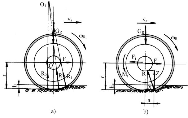 Asupra unei roti conduse cu pneuri care se rostogoleste cu o viteza constanta pe un drum orizontal mai actioneaza sarcina pe roata GR si forta de impingere sau tragere F. La miscarea neuniforma a rotii se mai iau in considerare forta de inertie Fj si momentul fortelor de inertie Mj.